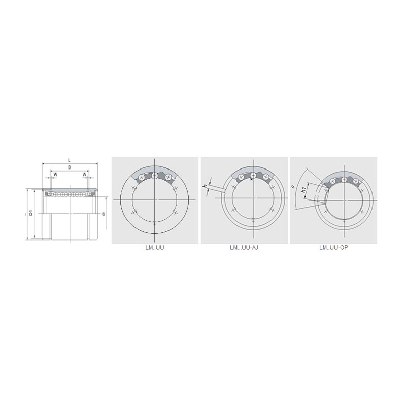 | Lm ... uu | Obvod lopty | Váha (kg) | Lm ... uu-aj | Obvod lopty | Váha | LM ... uu-op | Obvod lopty | Váha (kg) | mm | mm | Tolerancia | Tolerancia | D mm | Tolerancia (μm) | L mm | Tolerancia (μm) | B mm | Tolerancia (μm) | W (mm) | D1 (mm) | H (mm) | H1 (mm) | θ | Presnosť | Vysoký | Dynamika | Statický | |